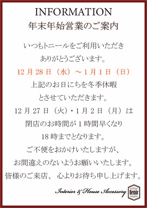 年末年始営業のご案内